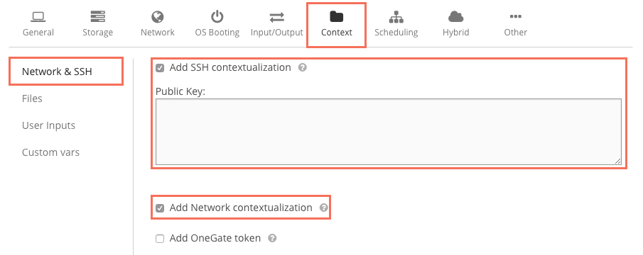 Включим параметры сети Add Network contextualization, а также авторизацию по RSA-ключам.