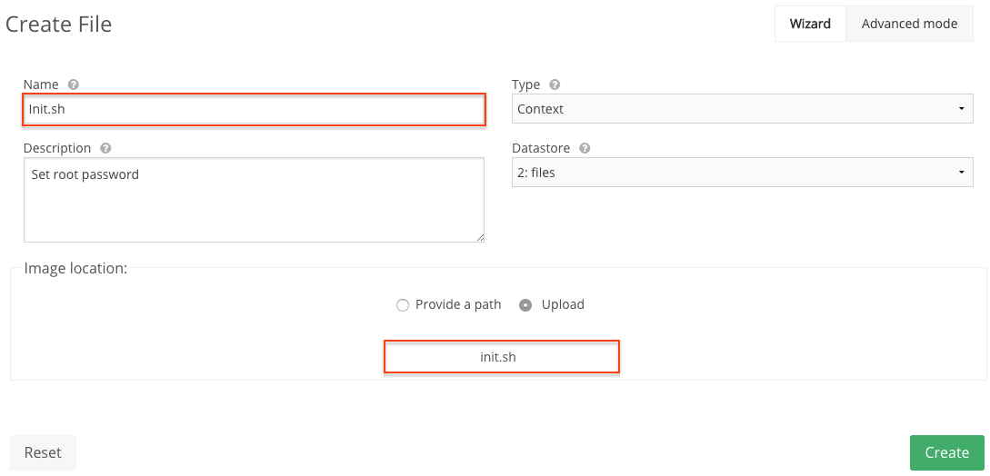 Переходим в Sunstone во вкладку Virtual Resources -> Files & Kernels, создаем новый файл и загружаем скрипт. Тип указываем CONTEXT и название, например init.sh.